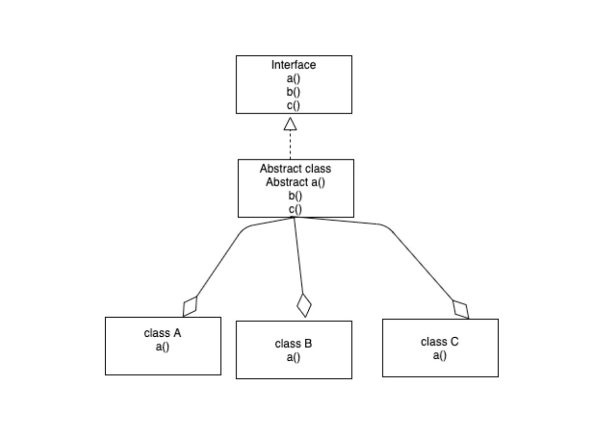 - 인터페이스를 구현한 추상클래스가 있다. 추상클래스에서는 a메서드만 추상메서드로 두고 b,c메서드는 구현을 했다. 이 추상클래스를 상속받은 A,B,C가 있는데 A,B,C에서는 a메서드내용만 구현하면된다.