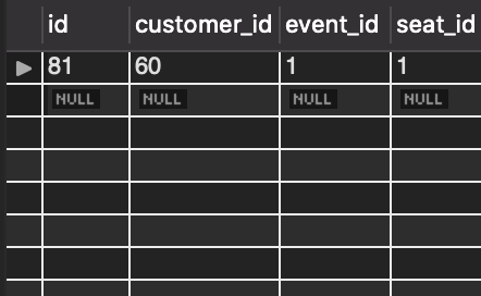 CREATE TABLE seat ( seat_id BIGINT AUTO_INCREMENT PRIMARY KEY, event_id INT, seat_col VARCHAR(5), seat_row INT, price DECIMAL, status VARCHAR(1) ) ENGINE=MyISAM; insert into seat(event_id,seat_col,seat_row,price,status) values(1,'A',1,15000,0); insert into seat(event_id,seat_col,seat_row,price,status) values(1,'A',2,15000,0);Table Lock