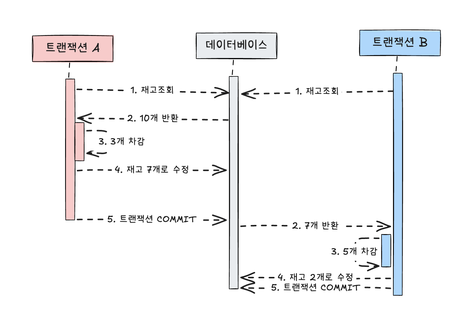 - 트랜잭션 B 시작: 트랜잭션 B도 티셔츠 재고를 읽으려고 시도하지만 트랜잭션 A가 이미 잠금을 획득했지만 Shared Lock이므로 B도 조회는 가능하다.