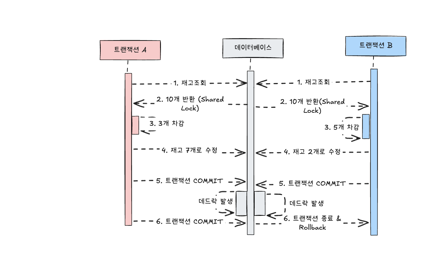 - 트랜잭션 A 진행: 트랜잭션 A는 3장의 티셔츠를 차감하여 재고를 7장으로 업데이트하고 커밋하려고 하는데 트랜잭션 B가 Shared Lock을 가지고 있으므로 데드락 발생